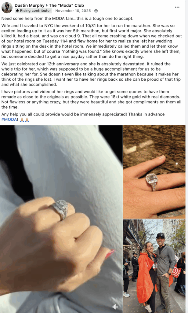 A while back, Dustin Murphy shared a post about how his wife, Molly, had just run the NYC Marathon, her first world major. She was beyond excited about her performance and the opportunity she had experienced, but when they got home, Molly realized she had left her wedding rings on the desk in their hotel room. They called immediately and knew exactly where they were left, but the rings were never recovered.